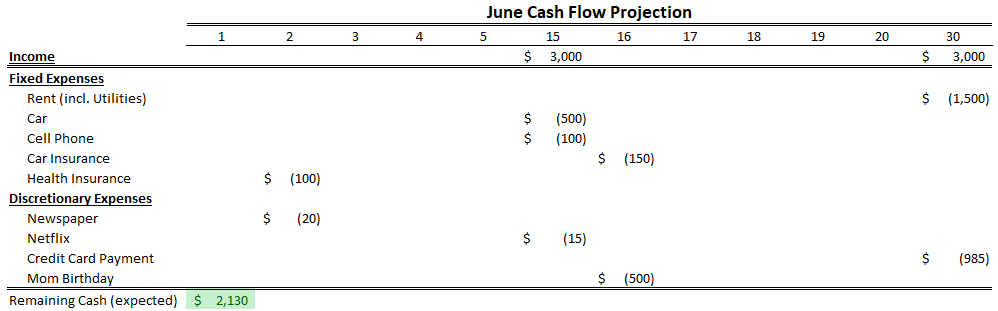 Maintaining a simple Cash Flow Table like the one below helps forecast cash needs into spending buckets with due dates. Visuals like this create a road map for how much cash is needed for what and when so it’s not accidentally spent on something else. There are many online services out there already to help maintain this data on your behalf so be sure to explore a bit.