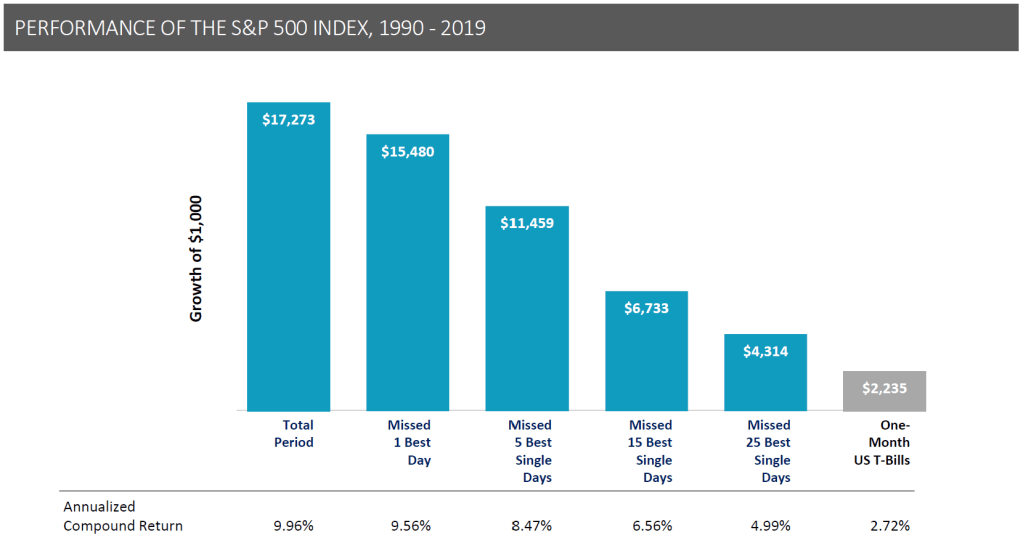 Uncertainty is inherent when investing, and that uncertainty is loudest in the short-term. It seems like there is always something to be afraid of, or a new opportunity to get in front of. Whatever it is, many investors try and act at the perfect time to either protect their portfolio against risks, or to get the biggest gain from investing early in an opportunity. Unfortunately, timing investments has shown to be just as much of a losing portfolio strategy as stock picking (remember, a diversified portfolio wins). Stay the course with respect to your financial plan and ride the ups and downs for a winning portfolio.
